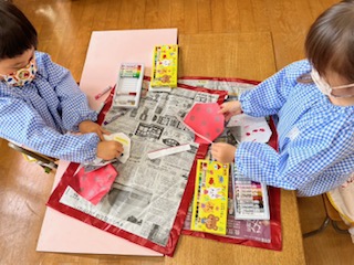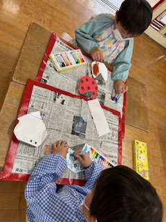 外遊びでは、ダンゴムシを探したり、チョウチョを追いかけたりして、虫に興味をもち始めた子どもたちは、折り紙でテントウムシをつくりました♪