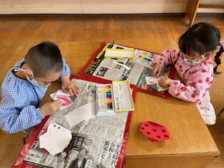 クレパスを使って、それぞれいろいろな模様をかいて、かわいいテントウムシができました♪