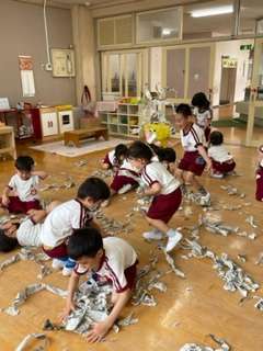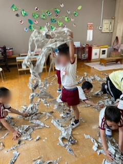 たくさんちぎって、集めた新聞紙を上に投げてヒラヒラ落ちてくる様子を楽しんでいました♪