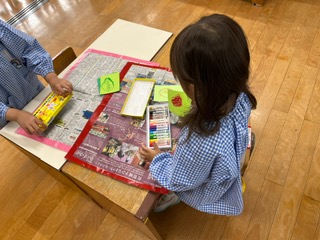 半紙を数回折り、絵の具に浸して、それをそーっと広げると「きれい!」「すごい!」と子どもたちも嬉しそうでした。