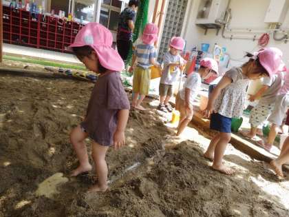 汚れることを気にせず、足の裏や手の平で水や泥の感触を存分に味わって楽しんでいました!