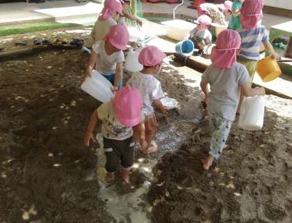 久しぶりの晴れ模様の中、桃組は幼稚園で初めてのどろんこ遊びをしました。
