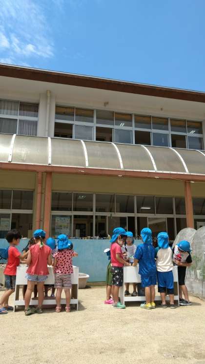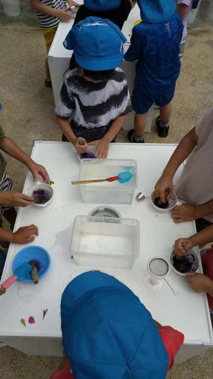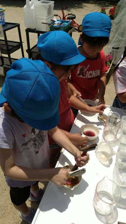花の手入れをしながら、枯れた花を摘み、色水遊びに使いました。マリーゴールドの花で、オレンジジュース、ペチュニアの花で、ブドウジュースができました。