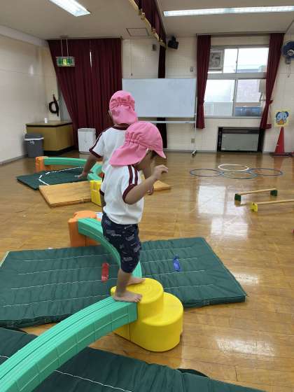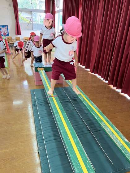 平均台やはしごなどは、初めは落ちるのを怖がっていましたが、4、5歳児さんが楽しそうに遊んでいる姿を見て、「自分もやってみよう」という気持ちをもって挑戦していました。