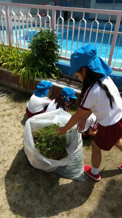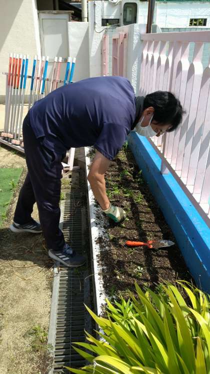 今まで、たくさんの花を咲かせてくれて、楽しませてくれて「ありがとう」の気持ちをもちながら、主事さんと一緒に片付けました。雑草抜きもしました。