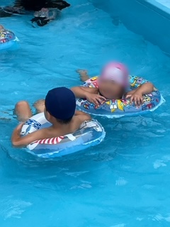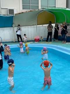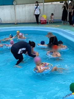 「おふろやさんにいこう」をプールの中でしたり、宝物拾いをしたり、大好きな浮き輪で遊んだりしているところを見ていただきました。楽しかったですね〜(^-^)