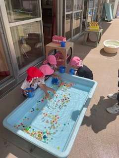 スーパーボールすくいや水てっぽう、どろんこ遊びなどで遊びながら水の気持ちよさを味わい、楽しんでいました☆