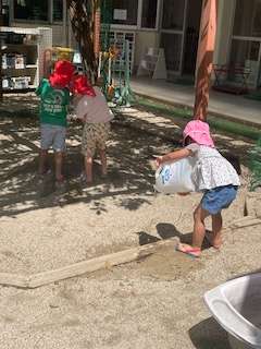 預かり保育(きらきら)に参加していた桃組、赤組の子どもたちは、砂場やテラスで水遊び!
