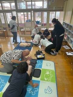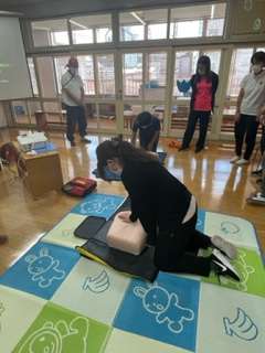 子どもの胸骨圧迫の仕方、AEDの使い方を実際に体験しながら、教えていただきました。