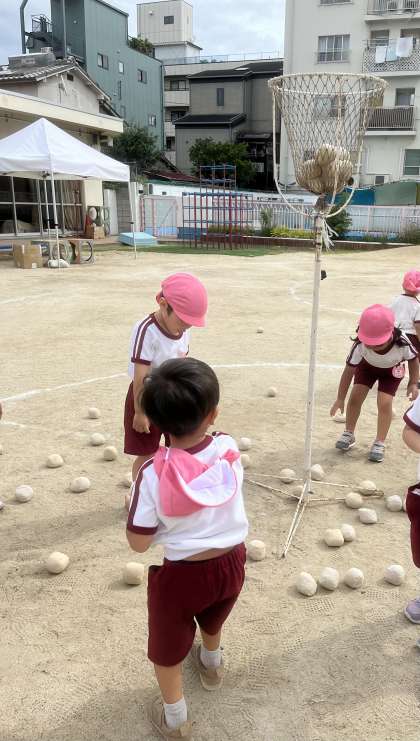 赤組さんが玉入れで遊んでいる姿を見て、自分たちもやってみたくなった桃組さん。