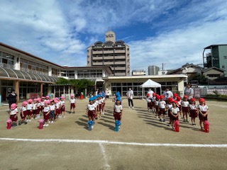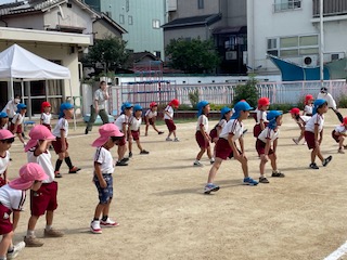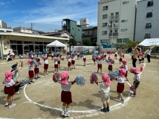 他のクラスの演技や競技にも興味をもち、「青組さんのバルーン、すごいね」「赤組さん、たくさん玉入ってる」「桃組さん、上手にクモの巣くぐってるね」などと見たり、応援したりすることも楽しんでいました♪
