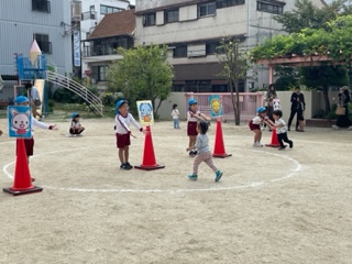 ゴールには、青組(5歳児)のお兄さん、お姉さんが待ってくれていて、お兄さん、お姉さんたちの手にタッチ(^^)/
