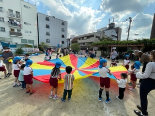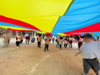 その後は、ひよこクラブのお友達も青組さんと一緒にパラバルーンで遊び、楽しかったですね!