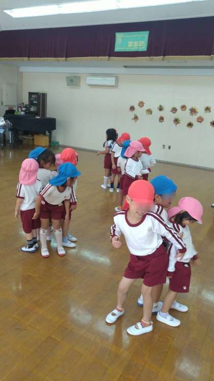ふれあい遊びでは、「ひっつきもっつき」をしました。小さい子の身長に合わせて、小さくなる青組と赤組の姿が見られました。