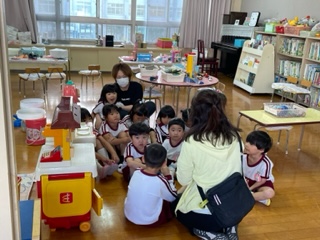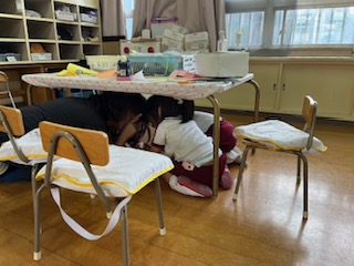 ままごと、ブロックなどの好きな遊びをしていての突然のチャイムと放送にドキッとした子どももいましたが、泣くこともなく、落ち着いて先生の話を聞いて避難することができましたね。