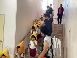 防災頭巾をかぶり、階段にも気をつけながら降りることができました。