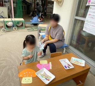 今回は、遊びの中でシールをはったり、顔をかいたりして、キノコをつくりました。