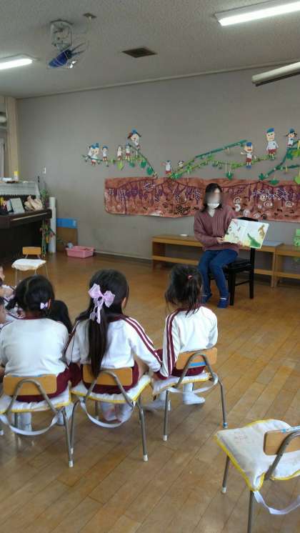文字に興味をもち始めている青組の子どもたちは、読んでくれるお母さんの優しい語りに、集中して見ていました。