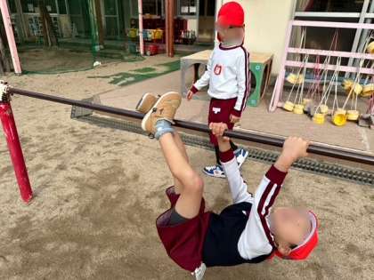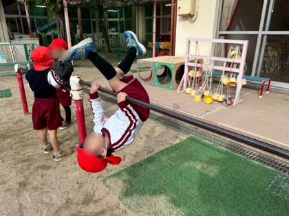 お友達が遊んでいる姿を見て刺激を受け「やってみる〜!」とどんどん遊びが広がっていきました。前回り、逆上がり、豚の丸焼きなどいろいろな技に繰り返し挑戦中です。