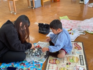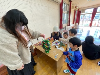 子どもたちの好きな飾りを保護者の方が用意してくださり、世界でたった一つのリースが完成しました!