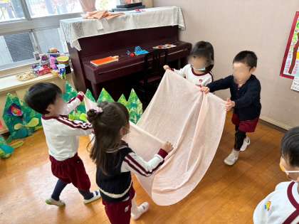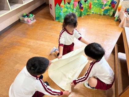 作品展の余韻も楽しみながら、少しずつ保育室も元の状態に戻すため片付けをしました。作品を飾るために使った布を友達と一緒に力を合わせて畳む子どもたち!