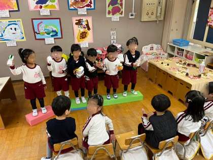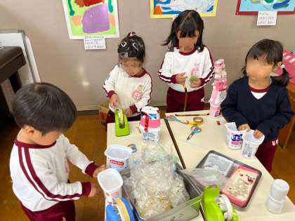 素材を使ってマラカスをつくり、曲に合わせて演奏会ごっこを楽しみました。