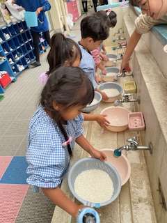 年長組は、ザルとボウルにもち米を入れて、「1、2、3!1、2、3!」と掛け声に合わせて研いでいました。お米が流れないように水を流して出来上がり!