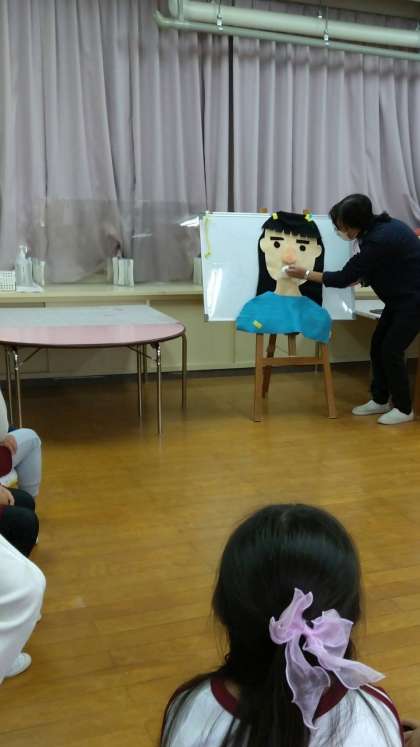 手づくりの教材を使って、鼻のかみ方を教えていただきました。