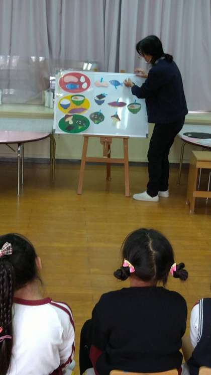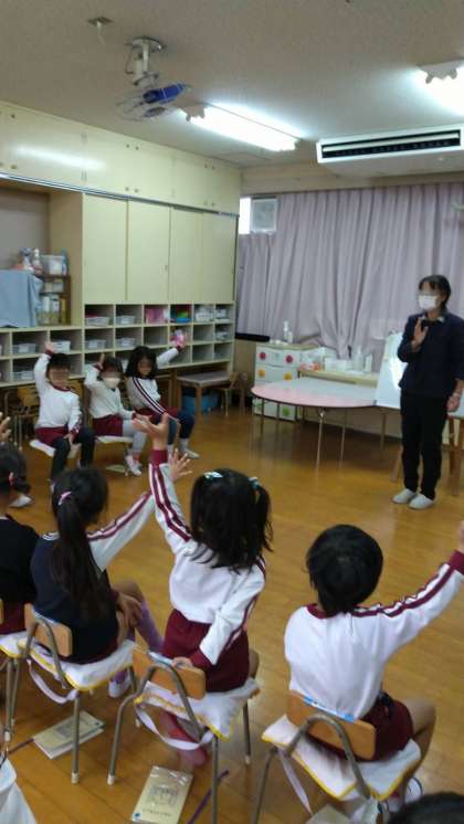 子どもたちは、知っている食べ物や好きな食べ物を聞かれると、積極的に答えていました。好き嫌いなく、バランスよく食べて、丈夫な体で風邪予防に努めましょう♪