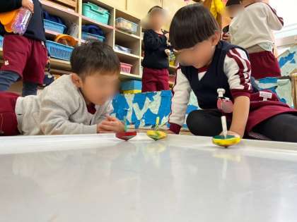 降園前には、こま名人対決をして遊びました。1番長く回った人が「今日のこま名人」になれるということで、張り切って勝負を楽しんでいました☆
