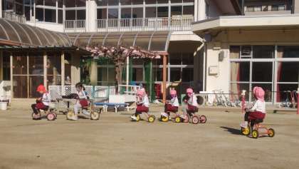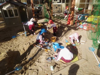 冬休みの預かり保育、日差しがぽかぽかして過ごしやすい2日間でした。外遊びでは、「らーめん体操」と「マラソン」をして体がぽかぽか。砂場でご飯をつくったり、三輪車やスクーターに乗って友達と連なって電車ごっこをしたりして遊びました。(『体』の育ち)