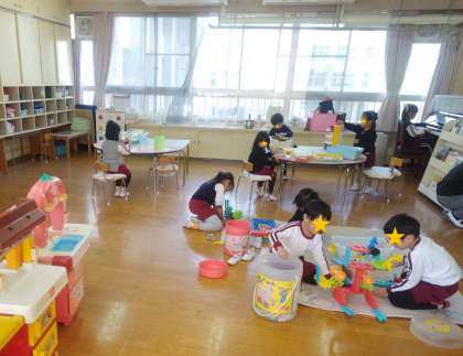 保育室では、ままごと、ブロック、ピアノ、製作など…思い思いの遊びを選んで、「いれて」「いいよ」と同年齢や異年齢の友達と同じ遊びを楽しんで過ごしました。(『徳』の育ち)