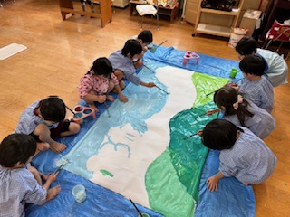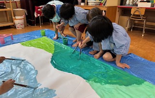 「塗れていないところはないかな...?」「だんだん、げんきもり(お話に出てくる森の名前)みたいになってきた!」と壁面づくりを楽しんでいました。