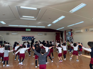 保護者の方との遊びでは、『こままわし、やっ!!』でふれあいを楽しんだり、みんなの遊びでは、『SEAっと体操』をし、海遊館の園外保育に向けて期待をもちながら楽しみました。
