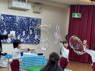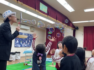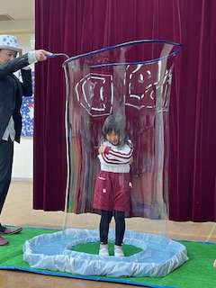ちょっとドキドキ顔の子どもたちでしたが、シャボン玉の中に入れた時のうれしそうな笑顔が、キラキラしていてとてもかわいらしかったです^_^