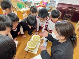 子どもたちにとって本物の果物に触れたり、考え想像したりと貴重な時間となりました!