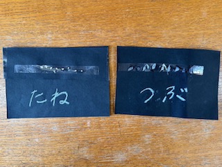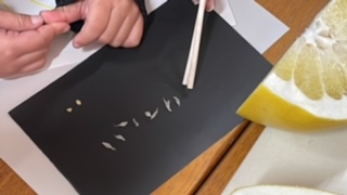 一粒ずつ取り出しよく見えるように黒い画用紙にのせ「この小さな粒がたくさん集まってこんなに大きな果物になったんだよ!」と伝えると子どもたちは更に驚いていました!「おひさまのパワーたくさんもらって大きくなったんだね!」と話していました!