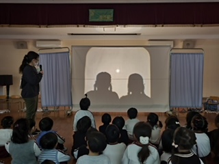 影絵のクイズがあったり、みんなでのふれあい遊び「こんにちは」をしたりと大盛り上がりで楽しい時間となりました。