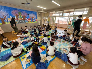 最後のお弁当は、青組の保育室で赤組(4歳児)と一緒に食べました。