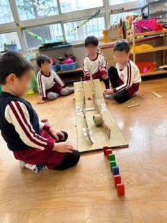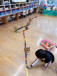 ダンボールを使ったことで、「この残ったところ滑り台みたいにしてスタート台つくって、ドミノ倒せるようにしてみよう!」と遊びが発展しました!その工夫がさらに遊びの面白さを増していました!