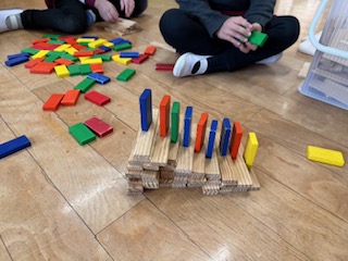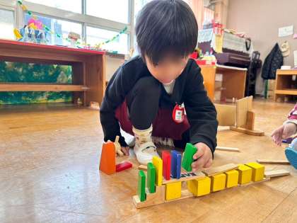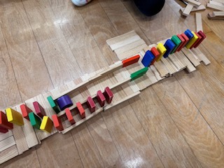 お部屋にある積み木を組み合わせて、階段や橋をつくったり、積み木を使って2つの道をつくりドミノとドミノの間隔を空けて並べ、手前のドミノが円柱の積み木に転がることでその先にあるドミノが倒れるといった『しかけ』をつくったり、友達と何度も考え、試しながら楽しんでいました!