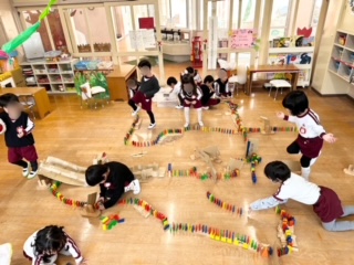 「ぼくはこっちから並べる!」「みんなで頑張って繋げよう!」と気合いも十分に並べていました!全部が並ぶ直前で惜しくも倒れてしまいましたが、子どもたちは「また、みんなで頑張れば長く繋げられる!」と前向きです!