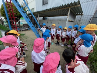 滑り台の安全な使い方を青組(5歳児)に教えてもらい、桃組(3歳児)も滑り台に挑戦!!みんな順番に並んだり滑ったりすることができましたね。