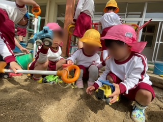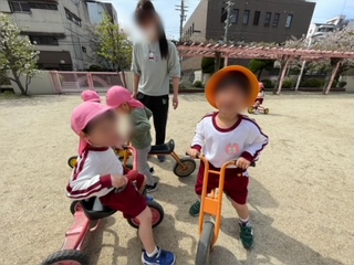 三輪車や砂場など、自分の好きな遊びを見つけ、楽しんでいました。