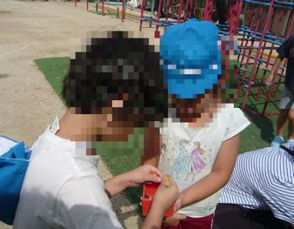 「ここにも種があったよ!」「(アサガオとフウセンカズラで)形が違うね」「同じフウセンカズラの種でも黒色と茶色がある!」などと、発見や気付きを友達と伝え合っていました。