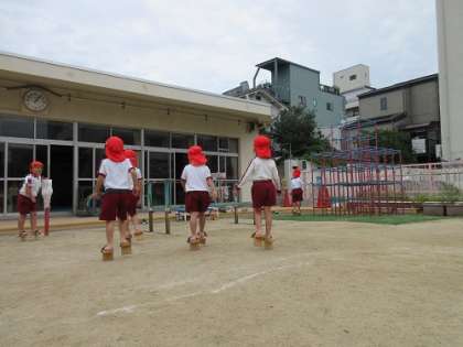 友達と一緒に体を動かす楽しさを感じながら、それぞれが目標をもって遊んでいる子どもたちは、日中の気温が少しづつ下がり涼しくなってきたことで、遊びに集中する姿が見られています。
