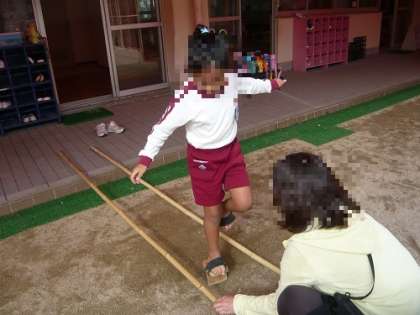 「バンブーダンスを一本歯下駄を履いてやってみたい」とチャレンジする姿や、5歳児のリレーに憧れ、遊び方を教えてもらいながら一緒に走ることを楽しむ3・4歳児の姿が見られます。