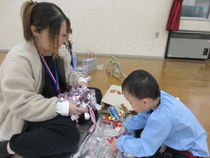 おうちから持って来てもらった材料や、幼稚園で準備していた材料をつかって、おうちの方と思い思いに飾り付け♪