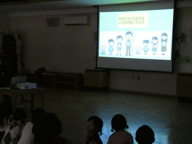 園内研究会で保健指導を行いました。全クラスで遊戯室に集まって「みんなのからだ げんきにおおきくなあれ!」のお話をしました。