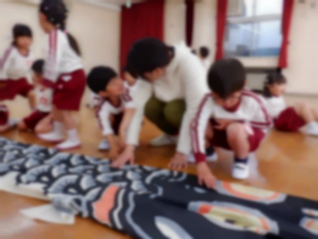 こいのぼりと背比べをしたり、うろこをさわってみたりしながら、近くで見るこいのぼりの大きさにびっくり!